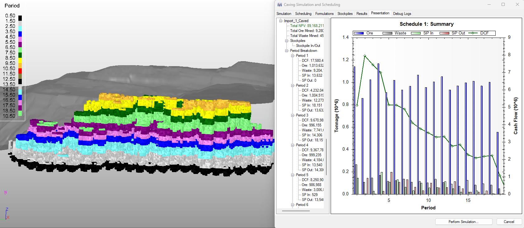 Simulate the material flow of block caving operations and generate optimized production schedules. This sub-module combines a physical mixing model (to simulate material movement and dilution) with an economic scheduler that maximizes Net Present Value (NPV).